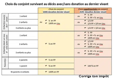 - En présence d’enfants, le conjoint survivant a alors 3 choix supplémentaires :